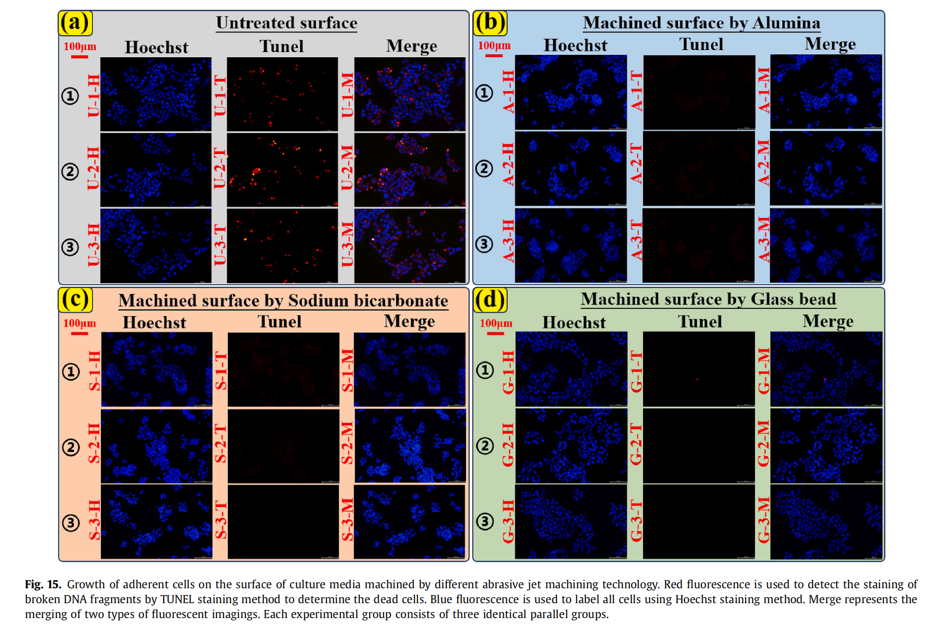 在细胞凋亡检测环节,团队选择慧蓝生物 Tunel(Cy3)试剂盒作为实验工具,通过特异性标记凋亡细胞断裂 DNA 的 3'-OH 末端,实现了凋亡信号的精准定位与定量分析。实验结果显示:经优化工艺处理的改性 PEEK 材料组,其诱导的细胞凋亡率显著低于传统工艺组,且凋亡细胞分布稀疏(红色荧光信号微弱);而未优化组则出现明显的凋亡聚集现象,这一差异通过试剂盒的高分辨率荧光成像清晰呈现。