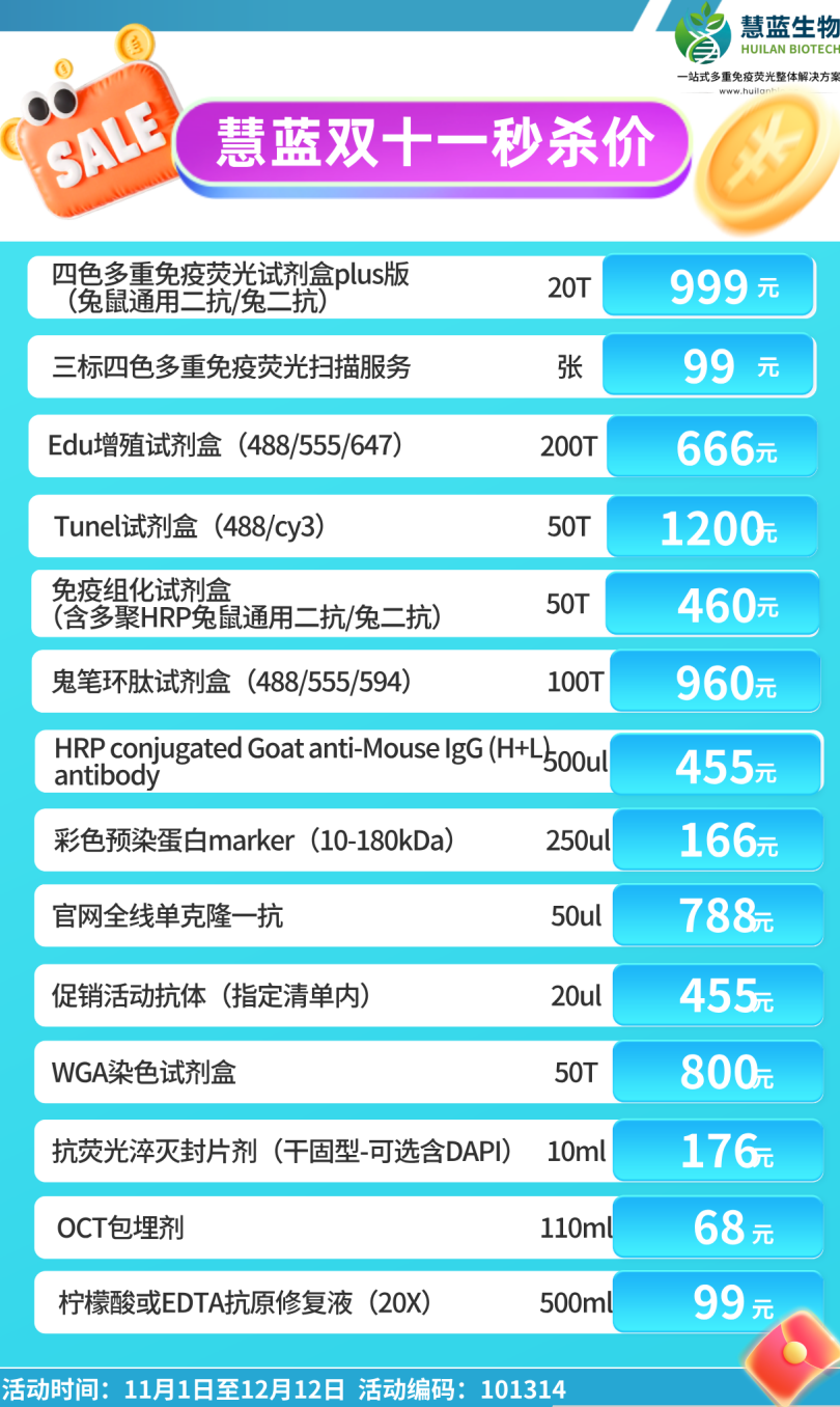 值此双十一盛大促销之际,为回馈广大科研工作者的支持,慧蓝生物推出重磅限时秒杀活动: