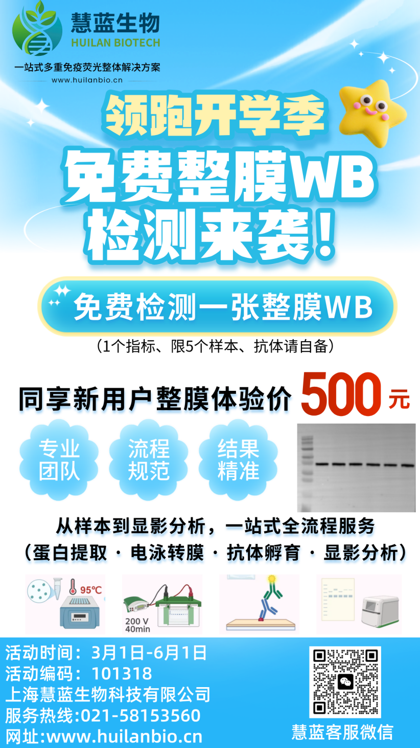 上海慧蓝生物科技推出新用户专享双重福利,让你用最低成本,体验全流程、标准化的WB检测服务,真正实现 “您提供样本与抗体,我们交付可靠数据”。