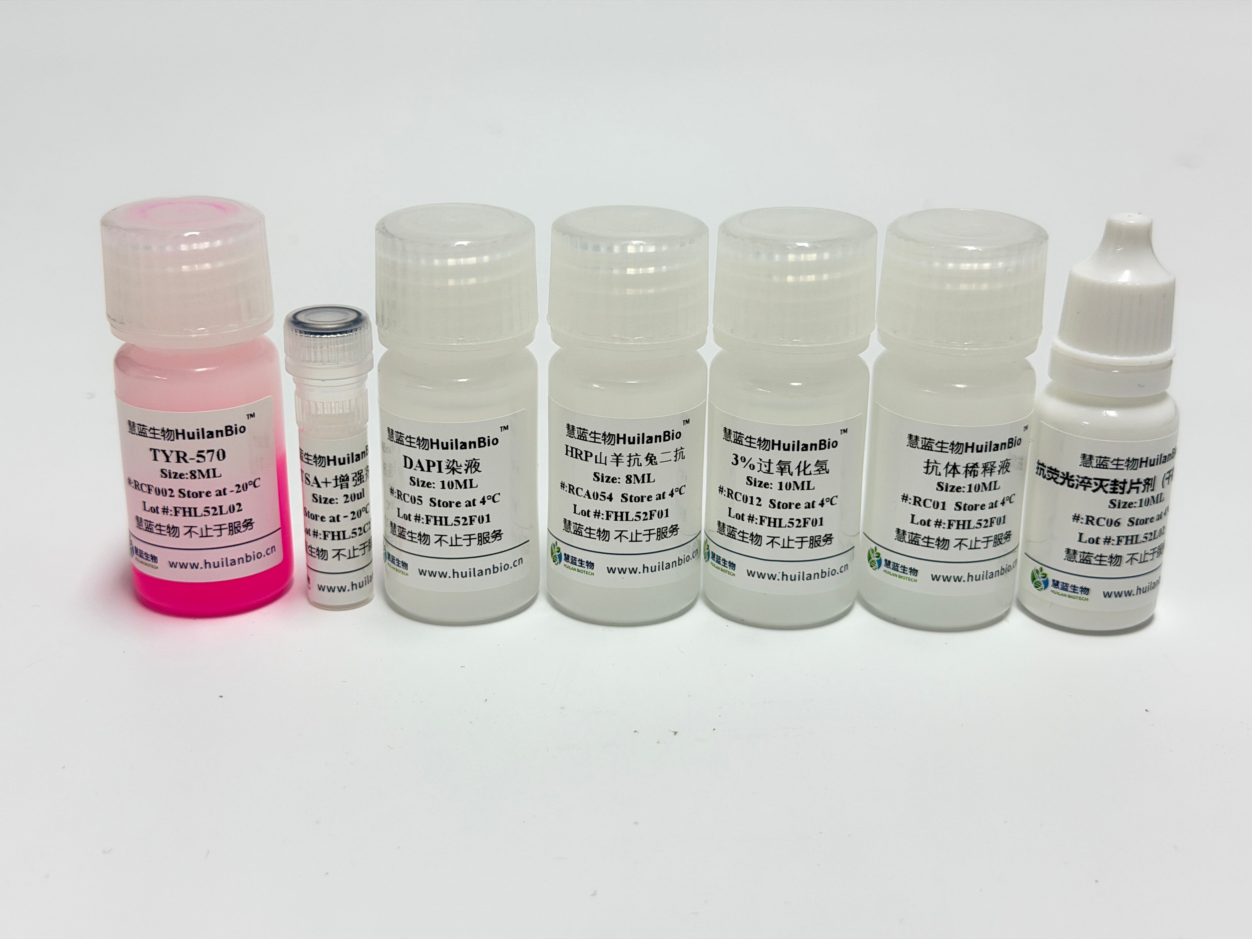 酪酰胺信号放大(TSA ,Tyramide signal amplification)技术是一类利用辣根过氧化酶(HRP)对靶 蛋白进行标记的酶学检测方法,类似常规免疫组化的 DAB 显色方法  ,TSA 技术同样采用 HRP 标记的二 抗,同样有对应的“显色 ”步骤(HRP 催化加入反应体系的酪胺荧光素底物,产生活化荧光底物,活化底 物可与抗原上的酪氨酸等残基共价结合,使样品上稳定的共价结合酪胺荧光素。之后用热修复法或者抗体洗脱液洗去非共价结合的一抗-二抗-HRP 复合物,重复下一种一抗-hrp 二抗来第二轮孵育,换另一种酪胺荧 光素底物,如此往复就可实现多重标记。 TSA 详细原理是利用酪胺 Tyramide 的过氧化物酶反应(酪胺盐在 HRP 催化 H202 下形成共价键结合位 点) ,产生大量的酶促产物,该产物能与周围的蛋白残基(包括色氨酸、组氨酸和酪氨酸残基)结合,这样在 抗原-抗体结合部位就有大量的荧光素沉积,结果使其检测信号得到 10- 100 倍增强。简单来说,用这种方法 做多重免疫荧光是利用二抗上带有的 HRP(而不是直接偶联荧光素),来催化后续添加入体系的非活性荧 光素。荧光素在 HRP 和过氧化氢的作用下被活化,跟临近蛋白的酪氨酸残基共价偶联,使得蛋白样品与荧 光素稳定结合。然后微波或煮沸或者水浴等热修复处理,前一轮非共价结合的抗体被洗掉,共价结合的荧 光素稳定共价结合在样本切片蛋白上。再换个一抗来第二轮孵育,周而复始。等到所有抗体孵育结束,荧 光素都结合好后,最后去检测结果。 由于每次体系中都只有单一抗体孵育,因此无需担心抗体交叉反应, 以及一抗二抗种属匹配问题,大大减少了实验设计时不同种属抗体选择匹配的限制。也就是说,如果用 TSA 技术,同一张片子上所有的靶标都可以选用特异性高的兔单克隆抗体。搭配同一支抗兔的 HRP 二抗就可以 进行实验,而且信号放大的倍数大大增强。本公司开发的试剂盒具体酪胺荧光染料为以下其中一种或者多 种:TYR-480,TYR-520,TYR-570,TYR-620,TYR-690,TYR-780。此试剂盒中的荧光染料可单独或配合使用。可以实现单标、双标、三标以及更多重荧光放大/多重同源抗体荧光标记等功能,极大丰富了此试剂盒的内涵。