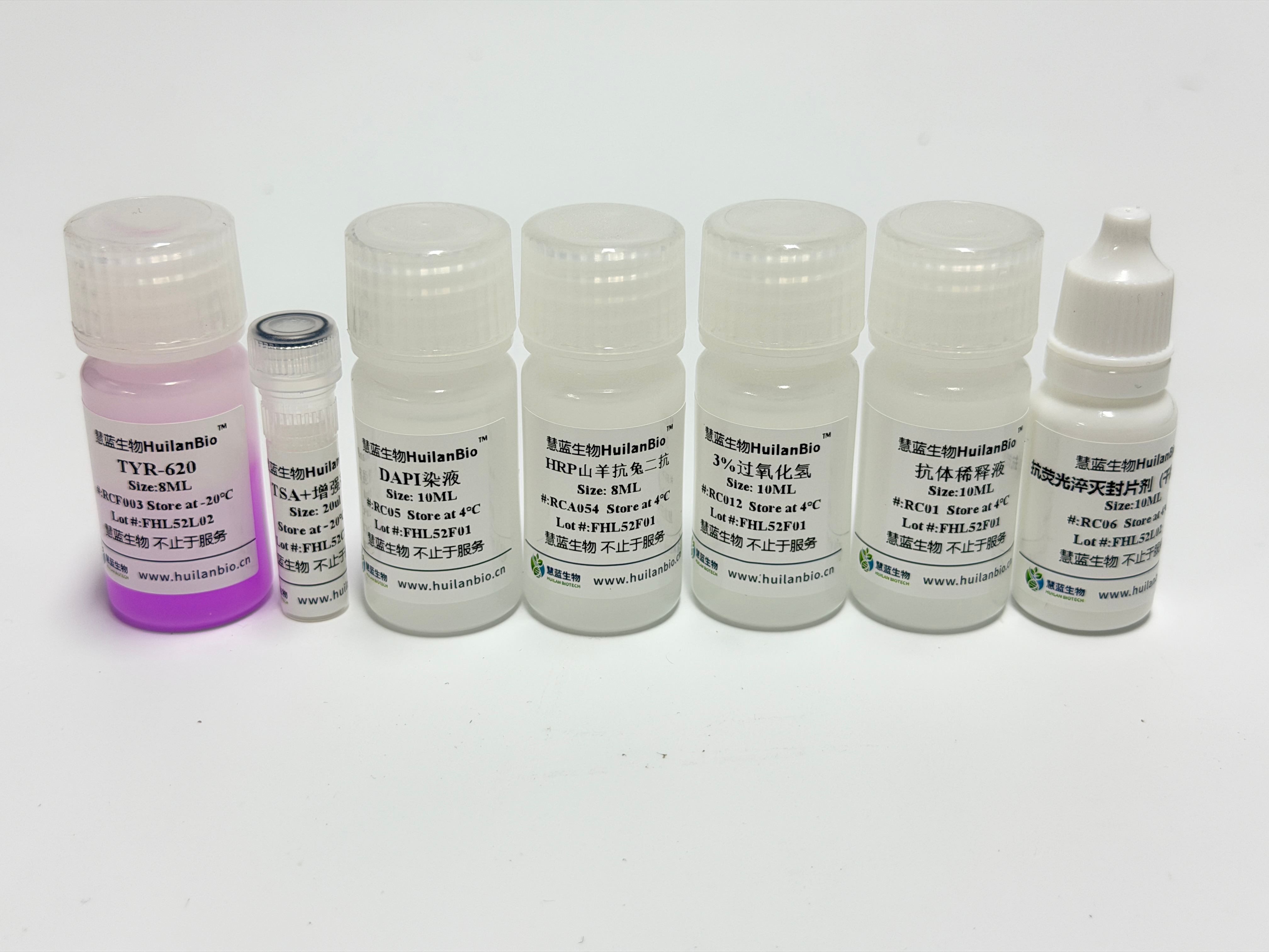 酪酰胺信号放大(TSA ,Tyramide signal amplification)技术是一类利用辣根过氧化酶(HRP)对靶 蛋白进行标记的酶学检测方法,类似常规免疫组化的 DAB 显色方法  ,TSA 技术同样采用 HRP 标记的二 抗,同样有对应的“显色 ”步骤(HRP 催化加入反应体系的酪胺荧光素底物,产生活化荧光底物,活化底 物可与抗原上的酪氨酸等残基共价结合,使样品上稳定的共价结合酪胺荧光素。之后用热修复法或者抗体洗脱液洗去非共价结合的一抗-二抗-HRP 复合物,重复下一种一抗-hrp 二抗来第二轮孵育,换另一种酪胺荧 光素底物,如此往复就可实现多重标记。 TSA 详细原理是利用酪胺 Tyramide 的过氧化物酶反应(酪胺盐在 HRP 催化 H202 下形成共价键结合位 点) ,产生大量的酶促产物,该产物能与周围的蛋白残基(包括色氨酸、组氨酸和酪氨酸残基)结合,这样在 抗原-抗体结合部位就有大量的荧光素沉积,结果使其检测信号得到 10- 100 倍增强。简单来说,用这种方法 做多重免疫荧光是利用二抗上带有的 HRP(而不是直接偶联荧光素),来催化后续添加入体系的非活性荧 光素。荧光素在 HRP 和过氧化氢的作用下被活化,跟临近蛋白的酪氨酸残基共价偶联,使得蛋白样品与荧 光素稳定结合。然后微波或煮沸或者水浴等热修复处理,前一轮非共价结合的抗体被洗掉,共价结合的荧 光素稳定共价结合在样本切片蛋白上。再换个一抗来第二轮孵育,周而复始。等到所有抗体孵育结束,荧 光素都结合好后,最后去检测结果。 由于每次体系中都只有单一抗体孵育,因此无需担心抗体交叉反应, 以及一抗二抗种属匹配问题,大大减少了实验设计时不同种属抗体选择匹配的限制。也就是说,如果用 TSA 技术,同一张片子上所有的靶标都可以选用特异性高的兔单克隆抗体。搭配同一支抗兔的 HRP 二抗就可以 进行实验,而且信号放大的倍数大大增强。本公司开发的试剂盒具体酪胺荧光染料为以下其中一种或者多 种:TYR-480,TYR-520,TYR-570,TYR-620,TYR-690,TYR-780。此试剂盒中的荧光染料可单独或配合使用。可以实现单标、双标、三标以及更多重荧光放大/多重同源抗体荧光标记等功能,极大丰富了此试剂盒的内涵。