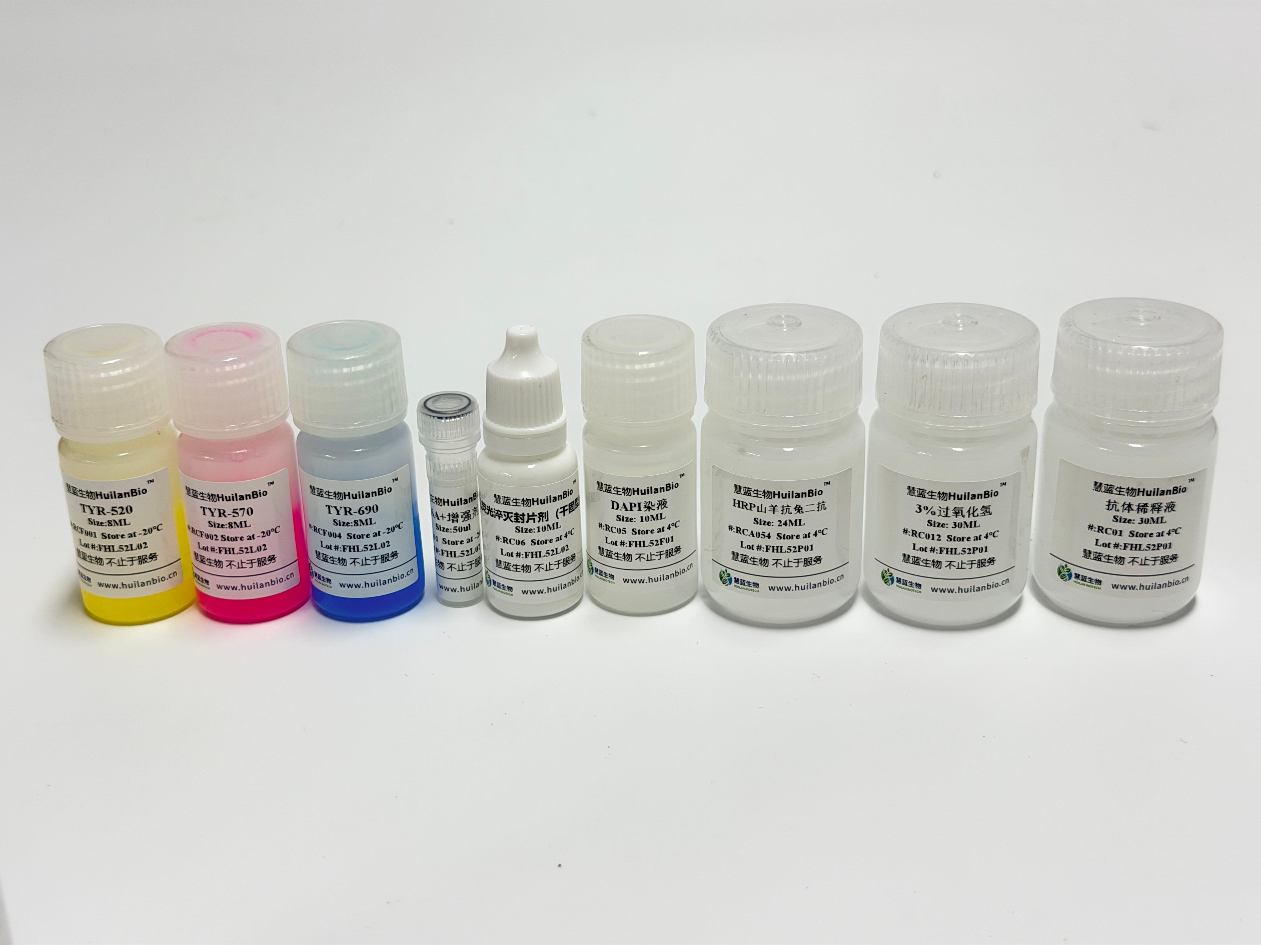 酪酰胺信号放大(TSA ,Tyramide signal amplification)技术是一类利用辣根过氧化酶(HRP)对靶 蛋白进行标记的酶学检测方法,类似常规免疫组化的 DAB 显色方法  ,TSA 技术同样采用 HRP 标记的二 抗,同样有对应的“显色 ”步骤(HRP 催化加入反应体系的酪胺荧光素底物,产生活化荧光底物,活化底 物可与抗原上的酪氨酸等残基共价结合,使样品上稳定的共价结合酪胺荧光素。之后用热修复法或者抗体洗脱液洗去非共价结合的一抗-二抗-HRP 复合物,重复下一种一抗-hrp 二抗来第二轮孵育,换另一种酪胺荧 光素底物,如此往复就可实现多重标记。 TSA 详细原理是利用酪胺 Tyramide 的过氧化物酶反应(酪胺盐在 HRP 催化 H202 下形成共价键结合位 点) ,产生大量的酶促产物,该产物能与周围的蛋白残基(包括色氨酸、组氨酸和酪氨酸残基)结合,这样在 抗原-抗体结合部位就有大量的荧光素沉积,结果使其检测信号得到 10- 100 倍增强。简单来说,用这种方法 做多重免疫荧光是利用二抗上带有的 HRP(而不是直接偶联荧光素),来催化后续添加入体系的非活性荧 光素。荧光素在 HRP 和过氧化氢的作用下被活化,跟临近蛋白的酪氨酸残基共价偶联,使得蛋白样品与荧 光素稳定结合。然后微波或煮沸或者水浴等热修复处理,前一轮非共价结合的抗体被洗掉,共价结合的荧 光素稳定共价结合在样本切片蛋白上。再换个一抗来第二轮孵育,周而复始。等到所有抗体孵育结束,荧 光素都结合好后,最后去检测结果。 由于每次体系中都只有单一抗体孵育,因此无需担心抗体交叉反应, 以及一抗二抗种属匹配问题,大大减少了实验设计时不同种属抗体选择匹配的限制。也就是说,如果用 TSA 技术,同一张片子上所有的靶标都可以选用特异性高的兔单克隆抗体。搭配同一支抗兔的 HRP 二抗就可以 进行实验,而且信号放大的倍数大大增强。本公司开发的试剂盒具体酪胺荧光染料为以下其中一种或者多 种:TYR-480,TYR-520,TYR-570,TYR-620,TYR-690,TYR-780。此试剂盒中的荧光染料可单独或配合使用。可以实现单标、双标、三标以及更多重荧光放大/多重同源抗体荧光标记等功能,极大丰富了此试剂盒的内涵。
