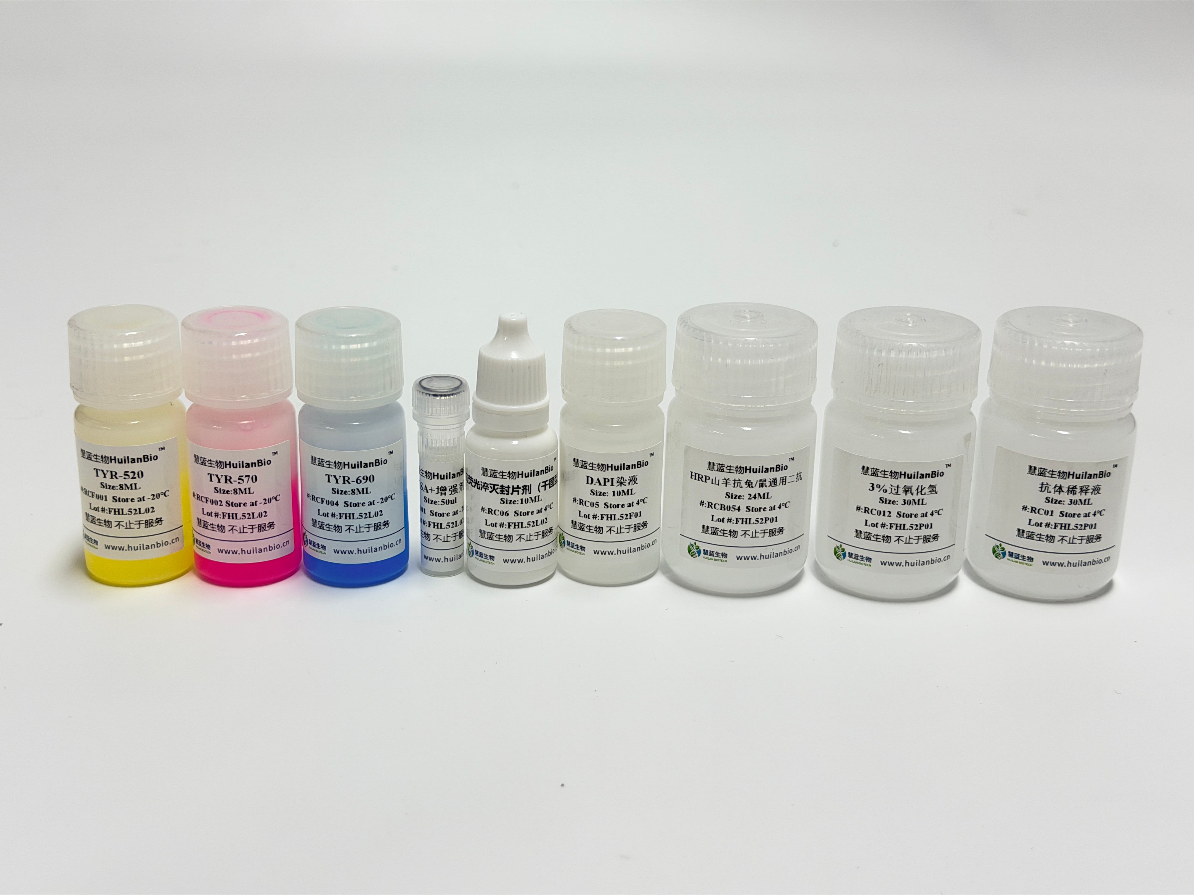 酪酰胺信号放大(TSA ,Tyramide signal amplification)技术是一类利用辣根过氧化酶(HRP)对靶 蛋白进行标记的酶学检测方法,类似常规免疫组化的 DAB 显色方法  ,TSA 技术同样采用 HRP 标记的二 抗,同样有对应的“显色 ”步骤(HRP 催化加入反应体系的酪胺荧光素底物,产生活化荧光底物,活化底 物可与抗原上的酪氨酸等残基共价结合,使样品上稳定的共价结合酪胺荧光素。之后用热修复法或者抗体洗脱液洗去非共价结合的一抗-二抗-HRP 复合物,重复下一种一抗-hrp 二抗来第二轮孵育,换另一种酪胺荧 光素底物,如此往复就可实现多重标记。 TSA 详细原理是利用酪胺 Tyramide 的过氧化物酶反应(酪胺盐在 HRP 催化 H202 下形成共价键结合位 点) ,产生大量的酶促产物,该产物能与周围的蛋白残基(包括色氨酸、组氨酸和酪氨酸残基)结合,这样在 抗原-抗体结合部位就有大量的荧光素沉积,结果使其检测信号得到 10- 100 倍增强。简单来说,用这种方法 做多重免疫荧光是利用二抗上带有的 HRP(而不是直接偶联荧光素),来催化后续添加入体系的非活性荧 光素。荧光素在 HRP 和过氧化氢的作用下被活化,跟临近蛋白的酪氨酸残基共价偶联,使得蛋白样品与荧 光素稳定结合。然后微波或煮沸或者水浴等热修复处理,前一轮非共价结合的抗体被洗掉,共价结合的荧 光素稳定共价结合在样本切片蛋白上。再换个一抗来第二轮孵育,周而复始。等到所有抗体孵育结束,荧 光素都结合好后,最后去检测结果。 由于每次体系中都只有单一抗体孵育,因此无需担心抗体交叉反应, 以及一抗二抗种属匹配问题,大大减少了实验设计时不同种属抗体选择匹配的限制。也就是说,如果用 TSA 技术,同一张片子上所有的靶标都可以选用特异性高的兔单克隆抗体。搭配同一支抗兔的 HRP 二抗就可以 进行实验,而且信号放大的倍数大大增强。本公司开发的试剂盒具体酪胺荧光染料为以下其中一种或者多 种:TYR-480,TYR-520,TYR-570,TYR-620,TYR-690,TYR-780。此试剂盒中的荧光染料可单独或配合使用。可以实现单标、双标、三标以及更多重荧光放大/多重同源抗体荧光标记等功能,极大丰富了此试剂盒的内涵。