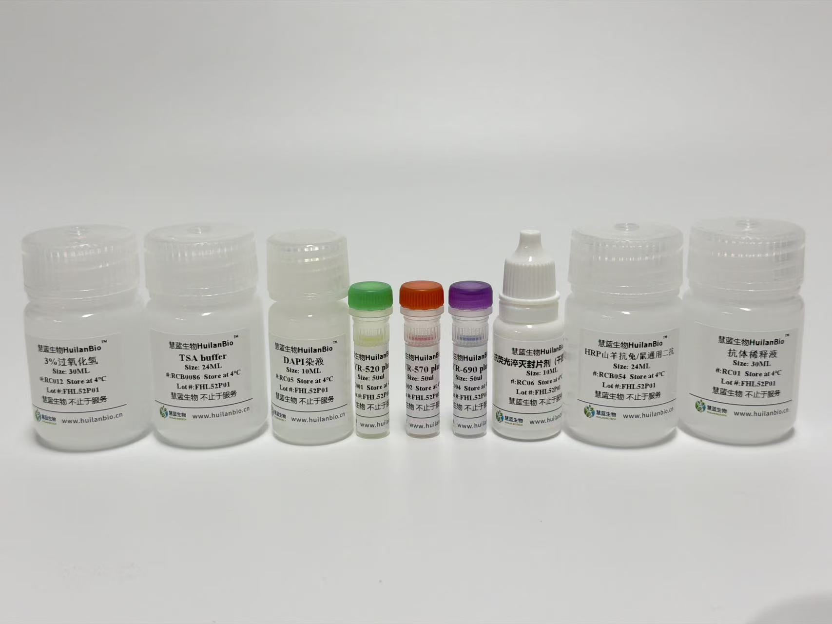 酪酰胺信号放大(TSA ,Tyramide signal amplification)技术是一类利用辣根过氧化酶(HRP)对靶 蛋白进行标记的酶学检测方法,类似常规免疫组化的 DAB 显色方法  ,TSA 技术同样采用 HRP 标记的二 抗,同样有对应的“显色 ”步骤(HRP 催化加入反应体系的酪胺荧光素底物,产生活化荧光底物,活化底 物可与抗原上的酪氨酸等残基共价结合,使样品上稳定的共价结合酪胺荧光素。之后用热修复法或者抗体洗脱液洗去非共价结合的一抗-二抗-HRP 复合物,重复下一种一抗-hrp 二抗来第二轮孵育,换另一种酪胺荧 光素底物,如此往复就可实现多重标记。 TSA 详细原理是利用酪胺 Tyramide 的过氧化物酶反应(酪胺盐在 HRP 催化 H202 下形成共价键结合位 点) ,产生大量的酶促产物,该产物能与周围的蛋白残基(包括色氨酸、组氨酸和酪氨酸残基)结合,这样在 抗原-抗体结合部位就有大量的荧光素沉积,结果使其检测信号得到 10- 100 倍增强。简单来说,用这种方法 做多重免疫荧光是利用二抗上带有的 HRP(而不是直接偶联荧光素),来催化后续添加入体系的非活性荧 光素。荧光素在 HRP 和过氧化氢的作用下被活化,跟临近蛋白的酪氨酸残基共价偶联,使得蛋白样品与荧 光素稳定结合。然后微波或煮沸或者水浴等热修复处理,前一轮非共价结合的抗体被洗掉,共价结合的荧 光素稳定共价结合在样本切片蛋白上。再换个一抗来第二轮孵育,周而复始。等到所有抗体孵育结束,荧 光素都结合好后,最后去检测结果。 由于每次体系中都只有单一抗体孵育,因此无需担心抗体交叉反应, 以及一抗二抗种属匹配问题,大大减少了实验设计时不同种属抗体选择匹配的限制。也就是说,如果用 TSA 技术,同一张片子上所有的靶标都可以选用特异性高的兔单克隆抗体。搭配同一支抗兔的 HRP 二抗就可以 进行实验,而且信号放大的倍数大大增强。本公司开发的试剂盒具体酪胺荧光染料为以下其中一种或者多 种:TYR-480,TYR-520,TYR-570,TYR-620,TYR-690,TYR-780。此试剂盒中的荧光染料可单独或配合使用。可以实现单标、双标、三标以及更多重荧光放大/多重同源抗体荧光标记等功能,极大丰富了此试剂盒的内涵。