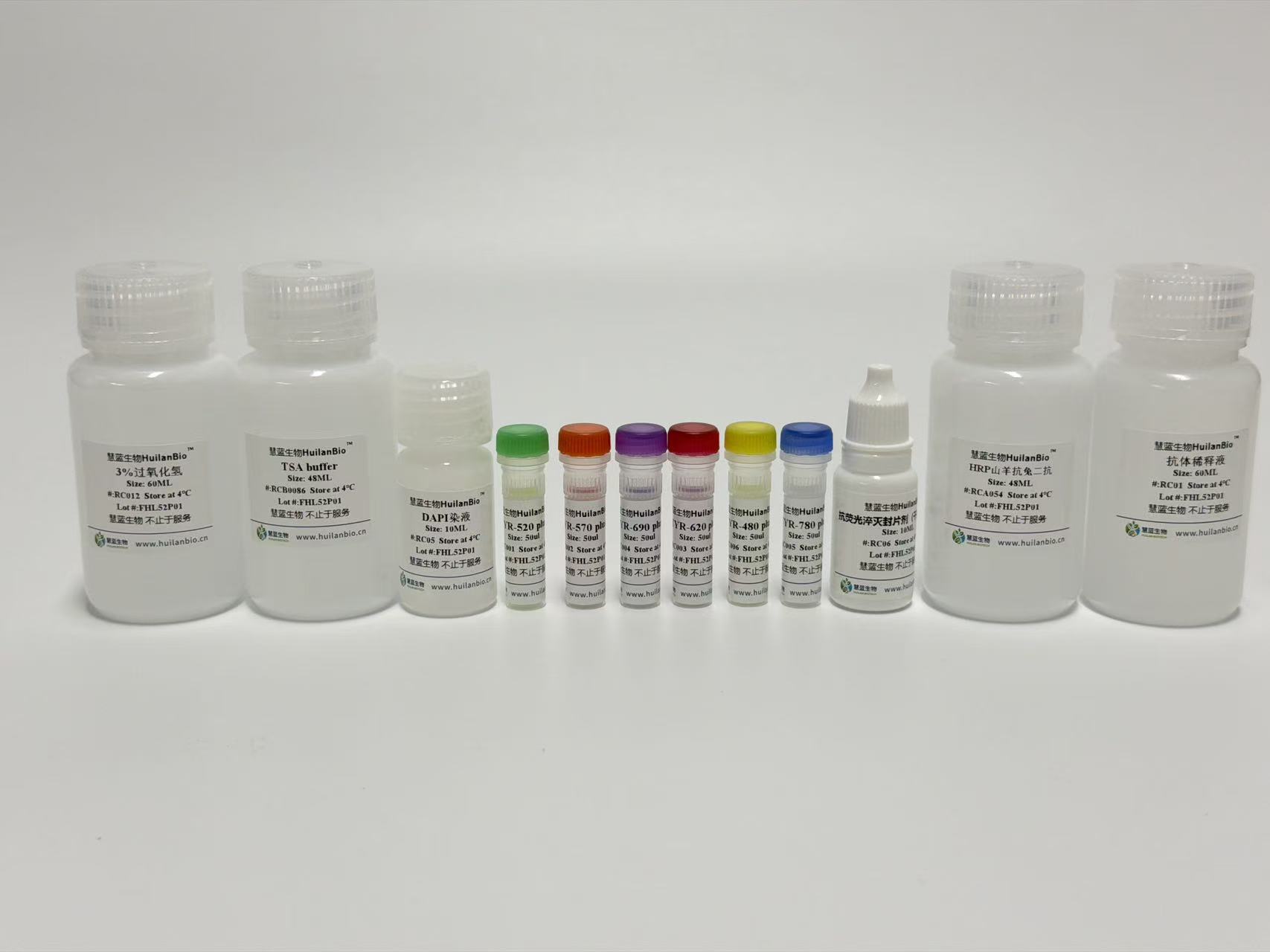 酪酰胺信号放大(TSA ,Tyramide signal amplification)技术是一类利用辣根过氧化酶(HRP)对靶 蛋白进行标记的酶学检测方法,类似常规免疫组化的 DAB 显色方法  ,TSA 技术同样采用 HRP 标记的二 抗,同样有对应的“显色 ”步骤(HRP 催化加入反应体系的酪胺荧光素底物,产生活化荧光底物,活化底 物可与抗原上的酪氨酸等残基共价结合,使样品上稳定的共价结合酪胺荧光素。之后用热修复法或者抗体洗脱液洗去非共价结合的一抗-二抗-HRP 复合物,重复下一种一抗-hrp 二抗来第二轮孵育,换另一种酪胺荧 光素底物,如此往复就可实现多重标记。 TSA 详细原理是利用酪胺 Tyramide 的过氧化物酶反应(酪胺盐在 HRP 催化 H202 下形成共价键结合位 点) ,产生大量的酶促产物,该产物能与周围的蛋白残基(包括色氨酸、组氨酸和酪氨酸残基)结合,这样在 抗原-抗体结合部位就有大量的荧光素沉积,结果使其检测信号得到 10- 100 倍增强。简单来说,用这种方法 做多重免疫荧光是利用二抗上带有的 HRP(而不是直接偶联荧光素),来催化后续添加入体系的非活性荧 光素。荧光素在 HRP 和过氧化氢的作用下被活化,跟临近蛋白的酪氨酸残基共价偶联,使得蛋白样品与荧 光素稳定结合。然后微波或煮沸或者水浴等热修复处理,前一轮非共价结合的抗体被洗掉,共价结合的荧 光素稳定共价结合在样本切片蛋白上。再换个一抗来第二轮孵育,周而复始。等到所有抗体孵育结束,荧 光素都结合好后,最后去检测结果。 由于每次体系中都只有单一抗体孵育,因此无需担心抗体交叉反应, 以及一抗二抗种属匹配问题,大大减少了实验设计时不同种属抗体选择匹配的限制。也就是说,如果用 TSA 技术,同一张片子上所有的靶标都可以选用特异性高的兔单克隆抗体。搭配同一支抗兔的 HRP 二抗就可以 进行实验,而且信号放大的倍数大大增强。本公司开发的试剂盒具体酪胺荧光染料为以下其中一种或者多 种:TYR-480,TYR-520,TYR-570,TYR-620,TYR-690,TYR-780。此试剂盒中的荧光染料可单独或配合使用。可以实现单标、双标、三标以及更多重荧光放大/多重同源抗体荧光标记等功能,极大丰富了此试剂盒的内涵。